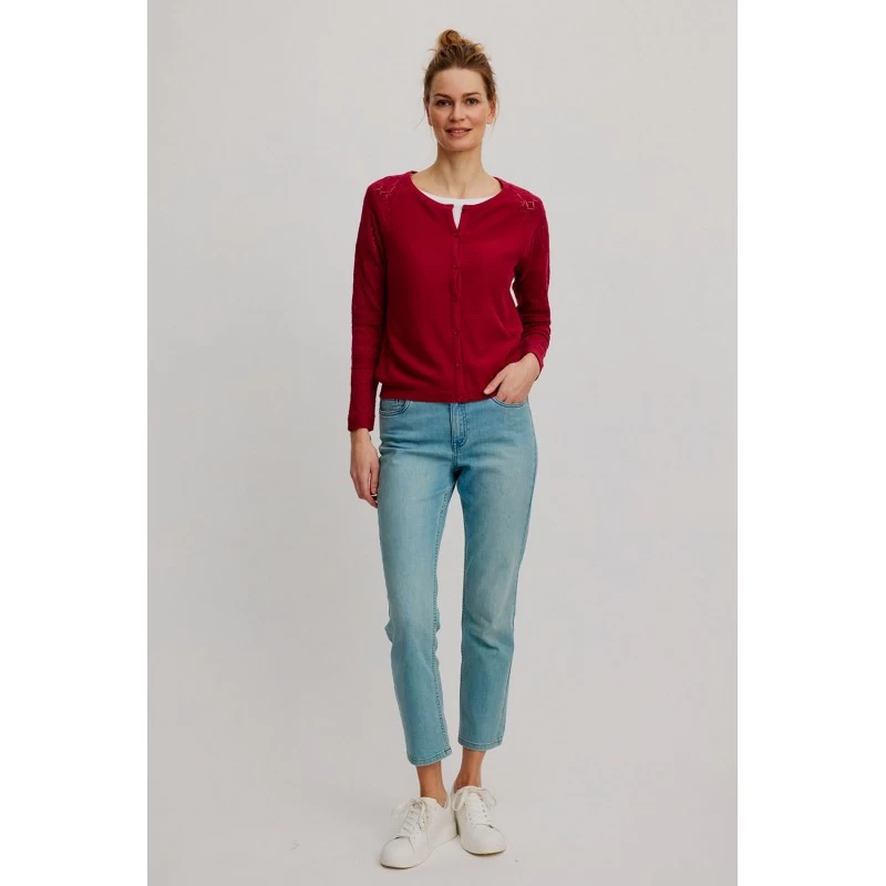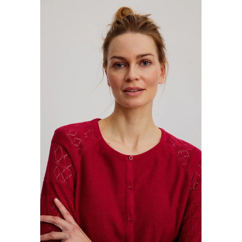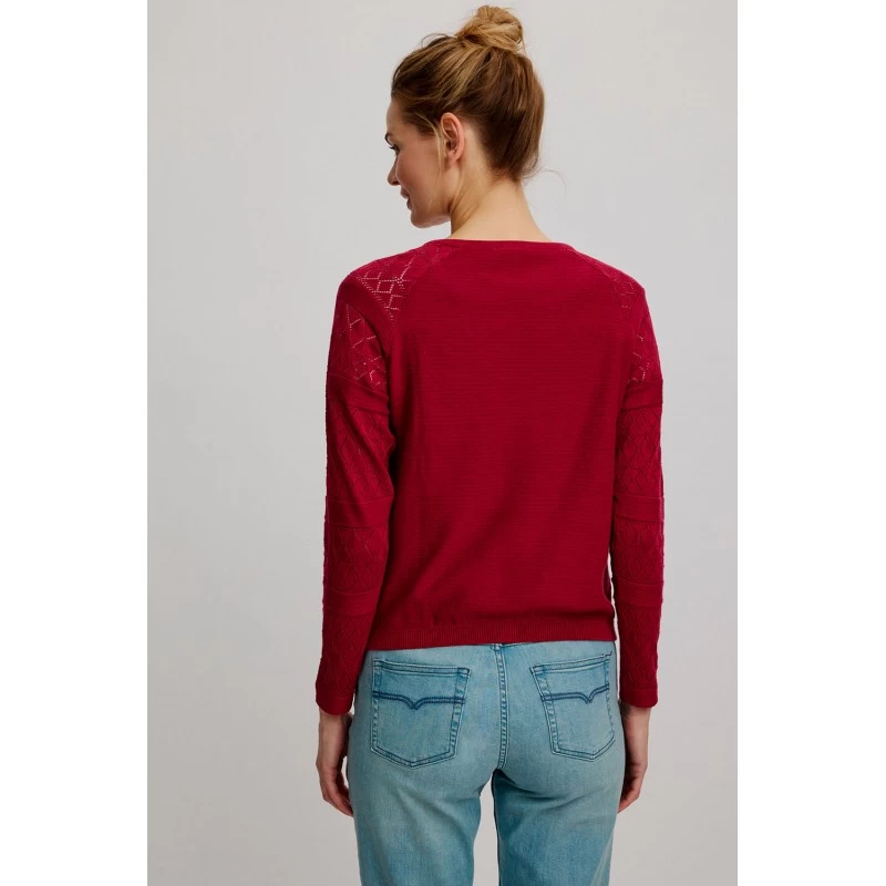 Description : col rond classique, manches raglan décorées d’un motif ajouré, (dentelle tricot)